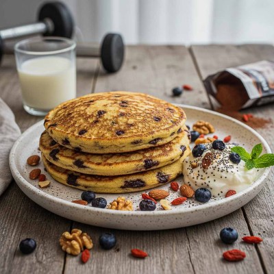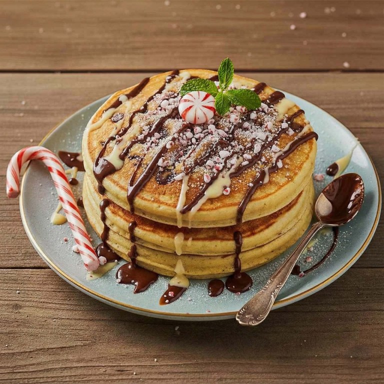 Fluffy peppermint pancakes with chocolate chips for season/festival specials.